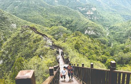焦作人30分鐘健身圈增添新內容——距離市區10公里、驅車30分鐘即可到達的中站區龍翔街道趙莊村窄門峽谷景區,沿山脊新建成的1300米長的木棧道,成為焦作市民登山健身、縱覽太行風光的免費去處。圖為新建成的窄門峽谷木棧道。
