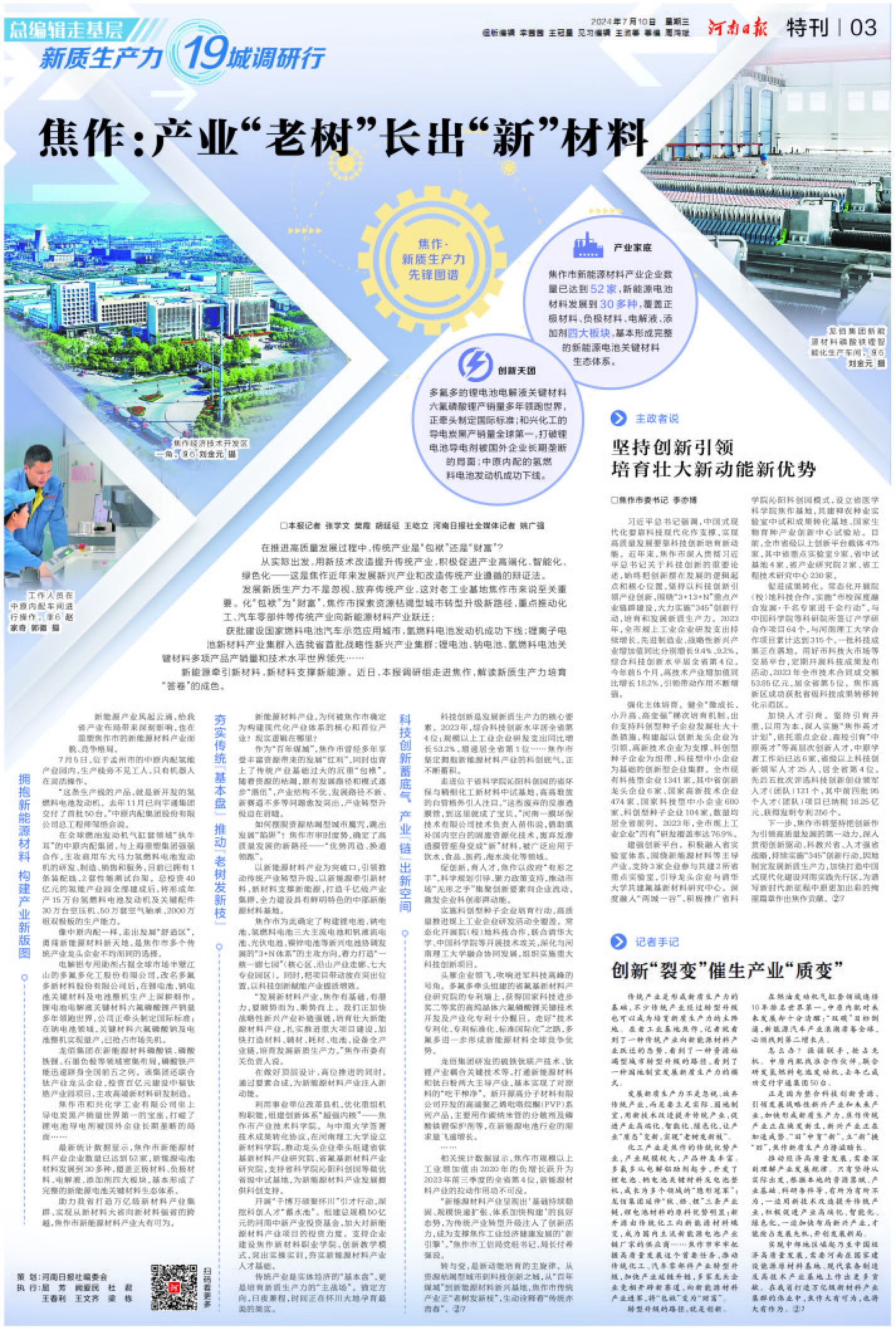 7月10日,《河南日?qǐng)?bào)》“總編輯走基層·新質(zhì)生產(chǎn)力19城調(diào)研行”以“頭版導(dǎo)讀+整版報(bào)道”的形式,推出題為《焦作:產(chǎn)業(yè)“老樹(shù)”長(zhǎng)出“新”材料》的深度報(bào)道,重點(diǎn)介紹我市化“包袱”為“財(cái)富”,探索資源枯竭型城市轉(zhuǎn)型升級(jí)新路徑,重點(diǎn)推動(dòng)化工、汽車零部件等傳統(tǒng)產(chǎn)業(yè)向新能源材料產(chǎn)業(yè)躍遷的經(jīng)驗(yàn)、做法與成效。