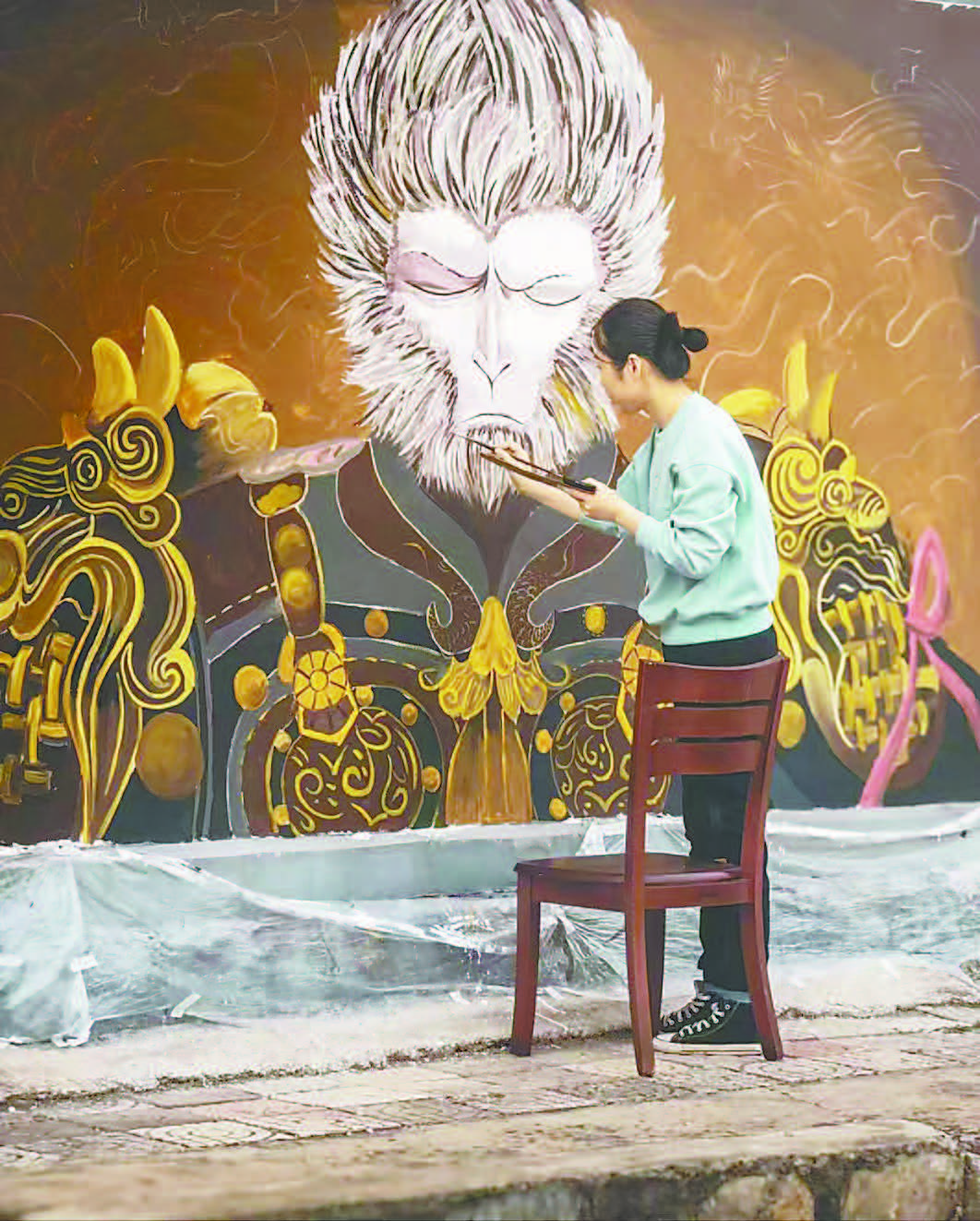 頭發簡單一盤,踩著家里搬出來的餐椅,神情專注地盯著墻上的畫,揮動著手中的畫筆為墻繪畫補色……“90后”姑娘王真,正沉浸在繪畫的寧靜中。