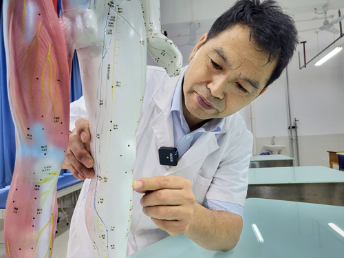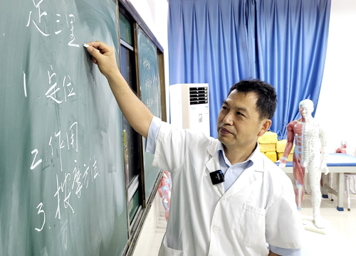 焦作市名中醫、焦作衛生醫藥學校針灸推拿教研室主任馬林為學生授課。